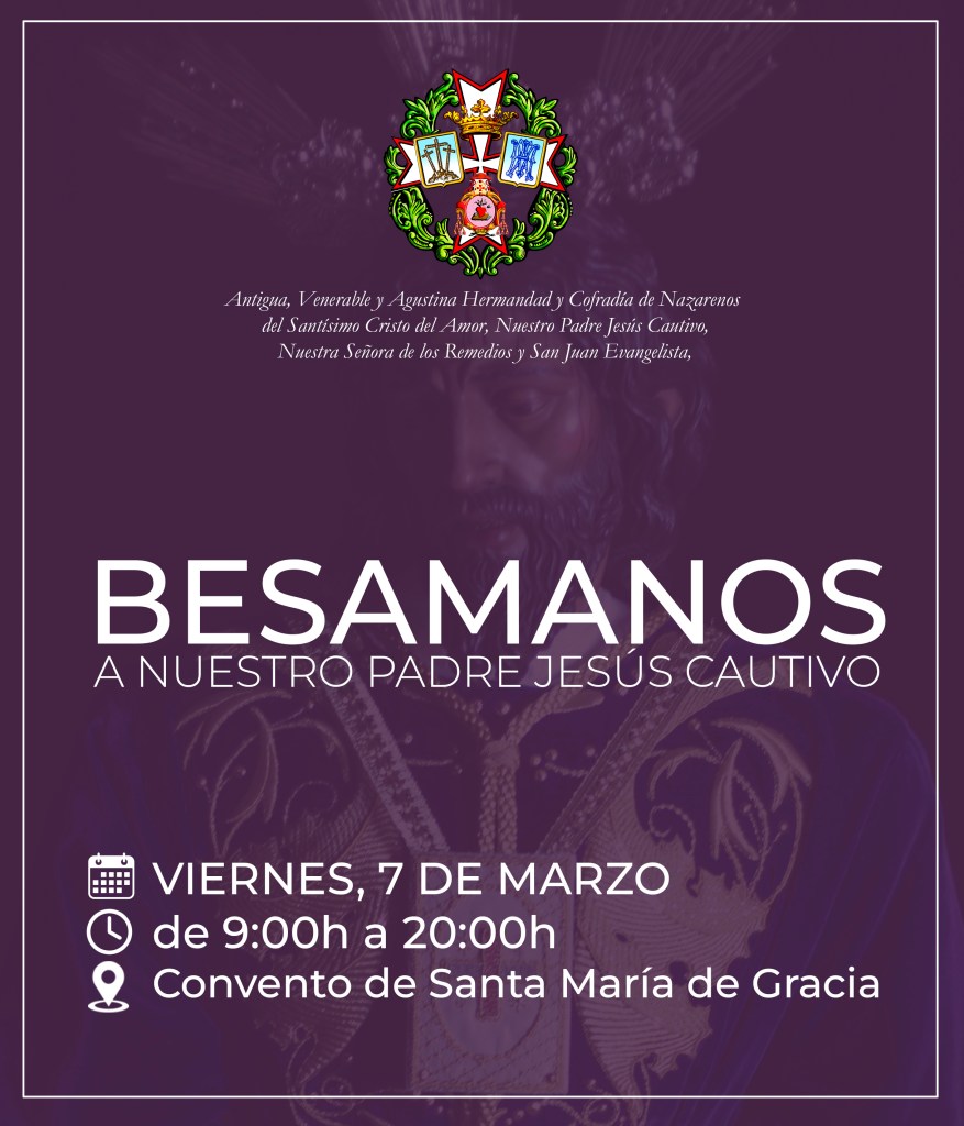 Este Viernes Besamanos a la Imagen de Ntro Padre Jesús Cautivo 5Mar 2025 Compártelo: Compartir en X (Se abre en una ventana nueva) X Compartir en Facebook (Se abre en una ventana nueva) Facebook Me gusta Cargando... Relacionado